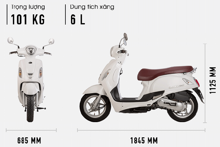 Khi nói đến dòng xe ga 50cc cho học sinh thì chúng ta có rất nhiều sự lựa chọn nhưng mẫu xe Kymco Like này vẫn chứng minh được sự khác biệt của mình thông qua vẻ ngoài trẻ trung và không kém phần năng động. Kích thước của xe lần lượt với chiều dài x chiều rộng x chiều cao là 1845mm x 685mm x 1125mm, chiều cao yên xe chỉ 760 mm nên đa phần học sinh hiện nay đều thoải mái sử dụng mà không gặp khó khăn gì nhất là các bạn nữ.