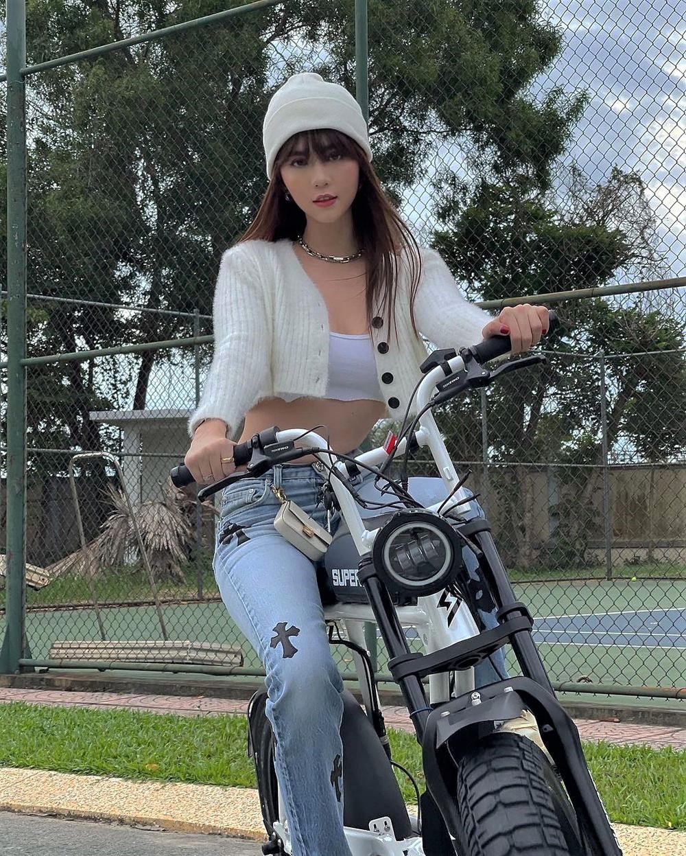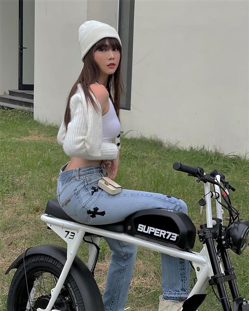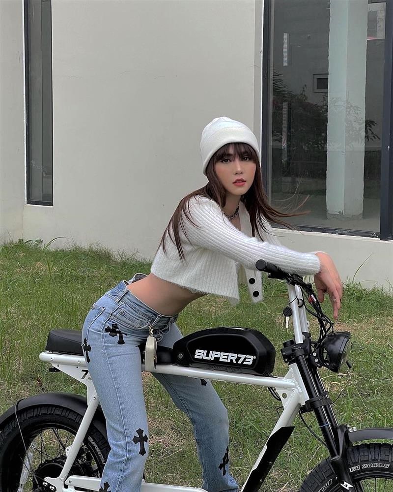 Mới đây, trên trang cá nhân, Ngọc Trinh vừa chia sẻ loạt ảnh khoe dáng bên xe đạp điện giống với Sơn Tùng MTP.