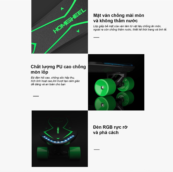 Ván trượt điện Homesheel H1 được trang bị các công nghệ tân tiến hiện đại gồm mạch chống quá nhiệt, quá tải; chống ngắt mạch; tự động ngắt khi đã sạc đầy. Ngoài ra, mẫu ván trượt điện này còn có ưu điểm vượt trội về khả năng leo dốc vượt trội do sử dụng động cơ Pro 6, đồng thời thắng kép đảm bảo độ an toàn tuyệt đối. Đặc biệt, bánh xe làm từ cao su cao cấp có độ đàn hồi cao, chống mòn, chống sốc, chống trượt nên rất an toàn khi sử dụng.
